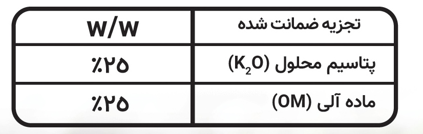 ۲۵ درصد پتاسیم با راندمان جذب بالا در این محلول باعث گردیده در زمان مصرف علاوه برنقش تغذیه ای پتاسیم در گیاه باعث افزایش مقاومت گیاه در مقابل انواع تنش های محیطی شده و این محصول را به عنوان یک محصول با خواص چندگانه تبدیل نموده است.